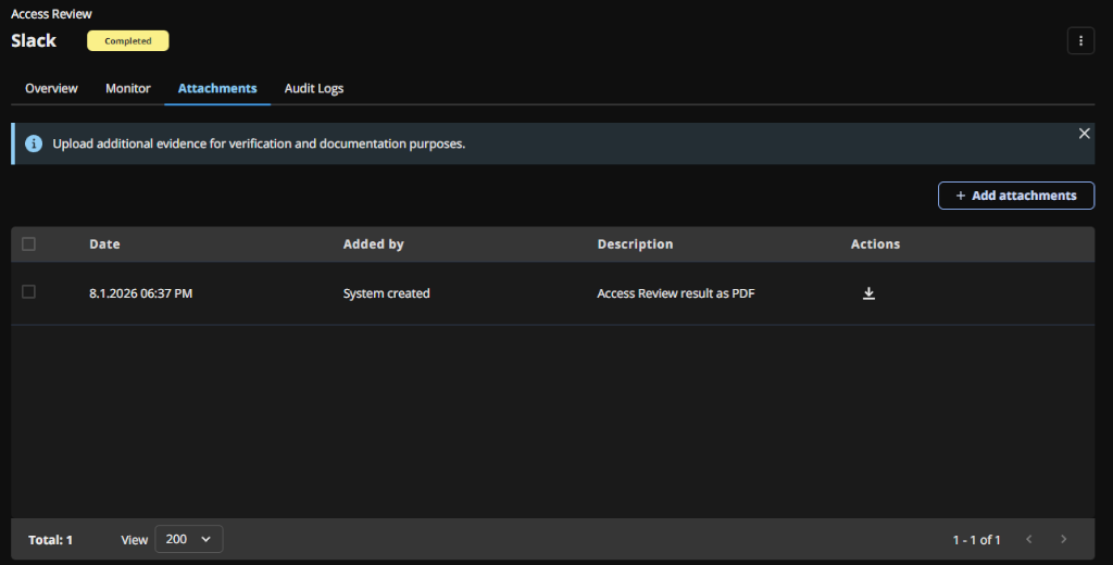 5.2 A system created access review results PDF is generated and attached automatically to the Attachments table when the review is completed.