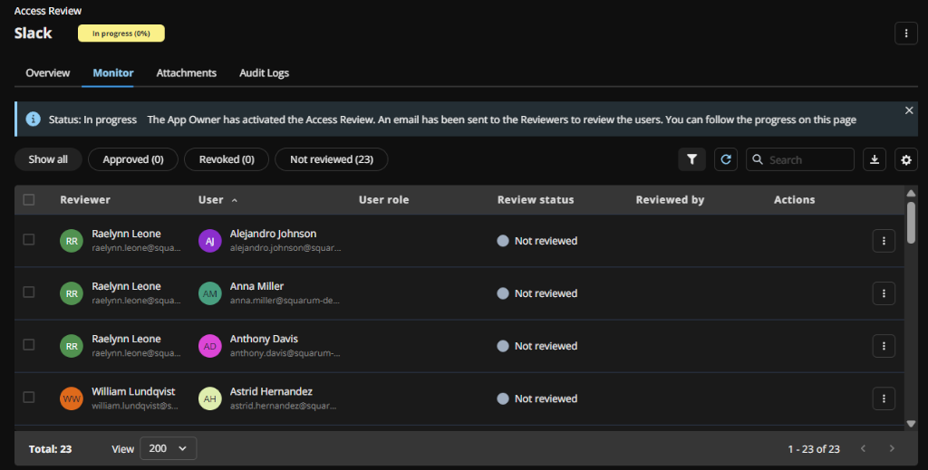 3.1 Now you have the User Access Review activated and reviewing the user’s access can be started.