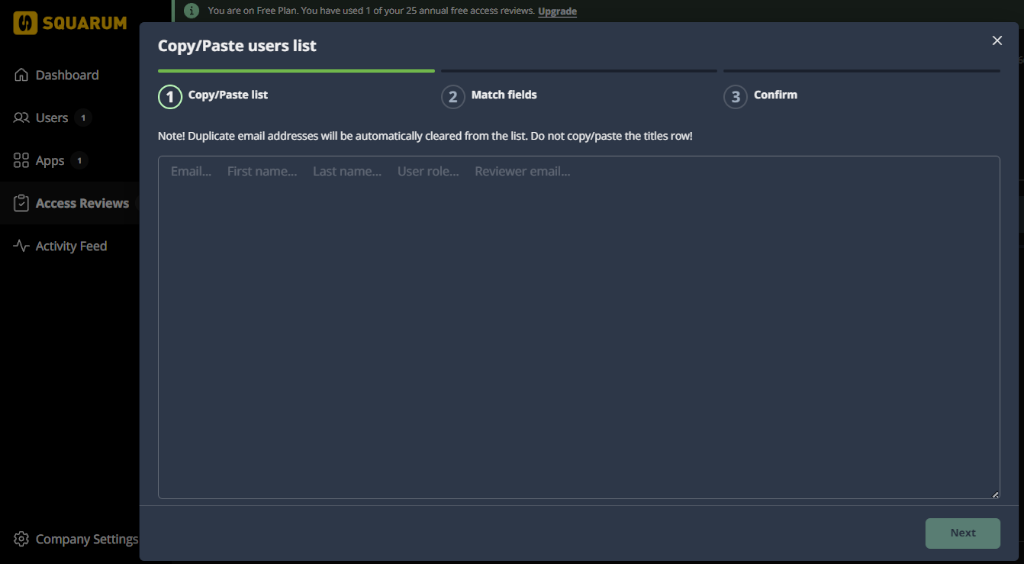 2.6 Now you have the users and reviewers added to Squarum. You may modify/add reviewers in case you did not have those in your spreadsheet. When ready, click the ‘Next’ button.